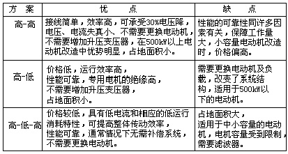 方案三:高-低方式,降壓變壓器與低壓變頻器組合,輸入6kV,輸出為0~690V,需要更換整套電動機系統(tǒng)。表1為三種方案的優(yōu)缺點比較。