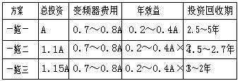 以三臺灰渣泵變頻調(diào)速系統(tǒng)為例,對上述三種拖動方式的投資回收期進行比較。假設(shè)用一臺變頻器進行改造,則不同方案的投資回收期比較情況如表3所示,可以看出,“一拖N”與“一拖一”方式比較,隨著N(≥2)的增加,前者優(yōu)點是投資回收期大大縮短,經(jīng)濟效應(yīng)更明顯,但缺點是一次接線、控制系統(tǒng)及運行操作相對復(fù)雜。