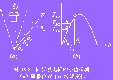 舉例來說,同步發(fā)電機(jī)與電網(wǎng)并聯(lián)以后,氣隙合成磁勢(shì)F受電網(wǎng)頻率的制約,以同步轉(zhuǎn)速n1旋轉(zhuǎn),功角的大小僅決定于轉(zhuǎn)子的轉(zhuǎn)速及位置。參看圖19.8,設(shè)發(fā)電機(jī)起初穩(wěn)定運(yùn)行于a點(diǎn),此時(shí)原動(dòng)機(jī)的輸入功率與發(fā)電機(jī)的電磁功率相平衡,即Pa=PMa,原動(dòng)機(jī)的轉(zhuǎn)矩也和發(fā)電機(jī)的電磁轉(zhuǎn)矩相平衡,即Ta=TMa 由于電網(wǎng)供電的需要,要求把發(fā)電機(jī)的電磁功率增大到PMb,整個(gè)調(diào)節(jié)過程為: ![]()