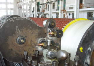 | 在整流子升高片間開槽安放電樞線圈 | 正在用測(cè)力打箍機(jī)在車床上用環(huán)氧無(wú)緯帶端部緊箍電樞 |