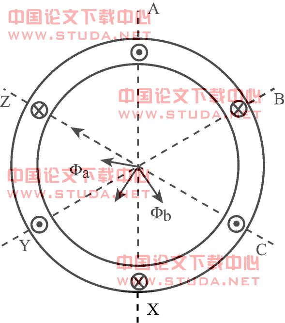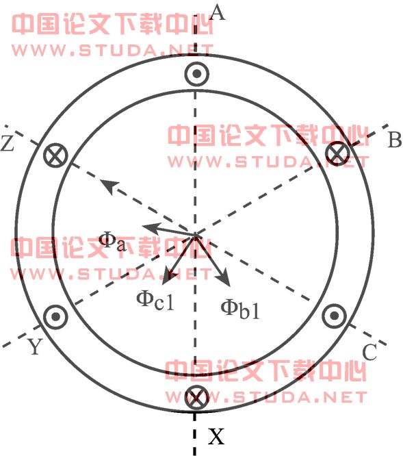 對于Δ連接的電動機,當外部端子確定以后,其內部的連接如圖3所示,其測量原理如下:如果三相繞組連接正確,當在其中的兩相之間,例如AB之間施加一個電壓時,其產(chǎn)生電場的分布情況見圖4,從圖中可以看出Φb,Φc的大小是相同的,因此測量出的電壓Uac(=Uc)和Ubc(=Ub)也基本是相等的。但是當其中的一相,如B相接反了時,情況就發(fā)生了變化,不考慮A相繞組磁場對B、C兩相繞組影響時的磁場分布如圖5所示,由于B相繞組和C相繞組中流過的是同一個電流,所以Φc1,Φb1的大小是相同的,但從圖中明顯可以看出Φa對B相繞組起去磁作用,而對C相繞組起助磁作用,從而使最終的B相磁通Φb小于C相的磁通Φc,進而導致Ub<Uc,即Ubc<Uac。。下面是一臺6個端子全部引出的380V Δ連接三相異步電機定子繞組的驗證測試數(shù)據(jù):